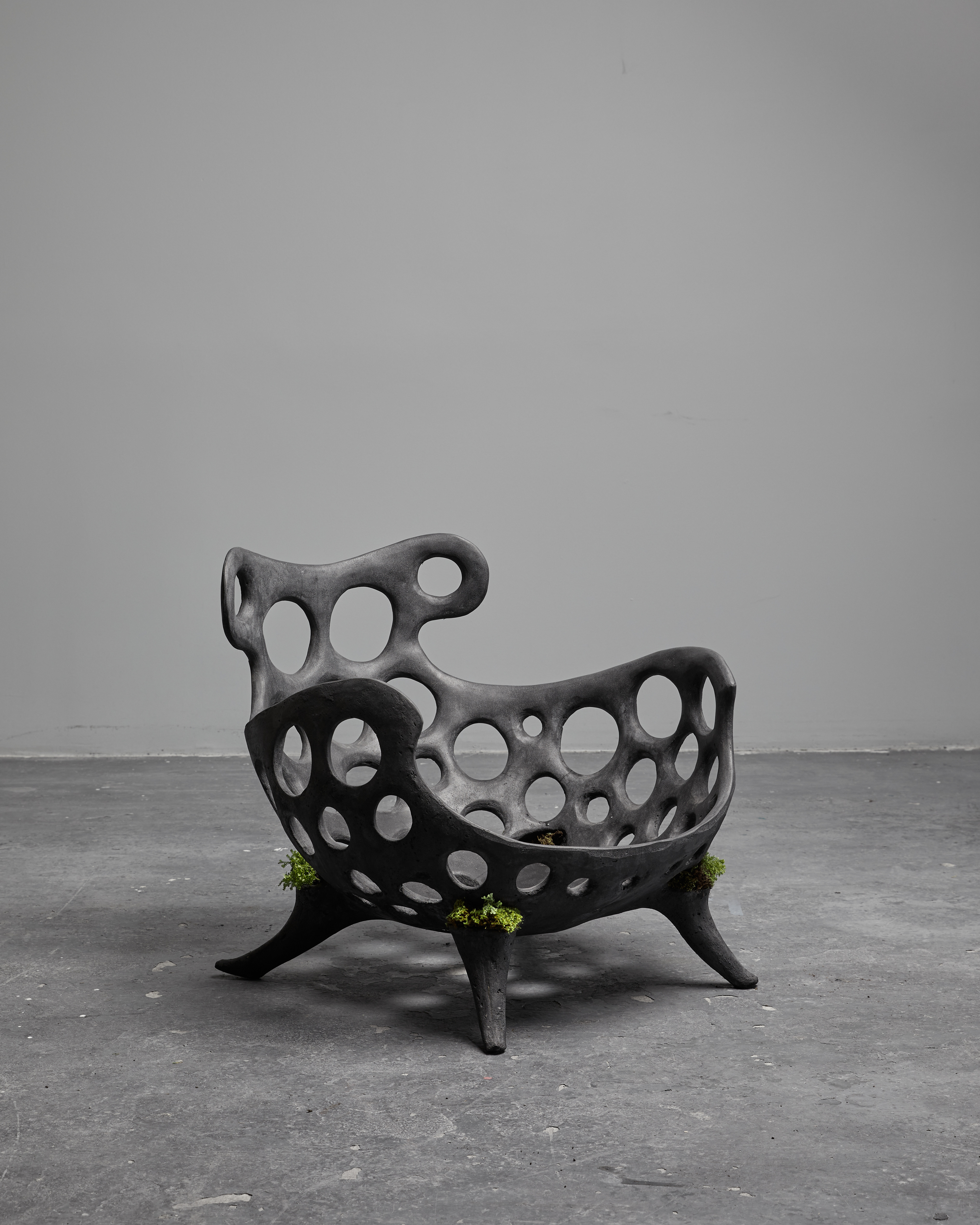 This handcrafted club chair is clean, sensuous and weather defiant. The form references the organic shapes of bones and has pockets for nurturing live plants.